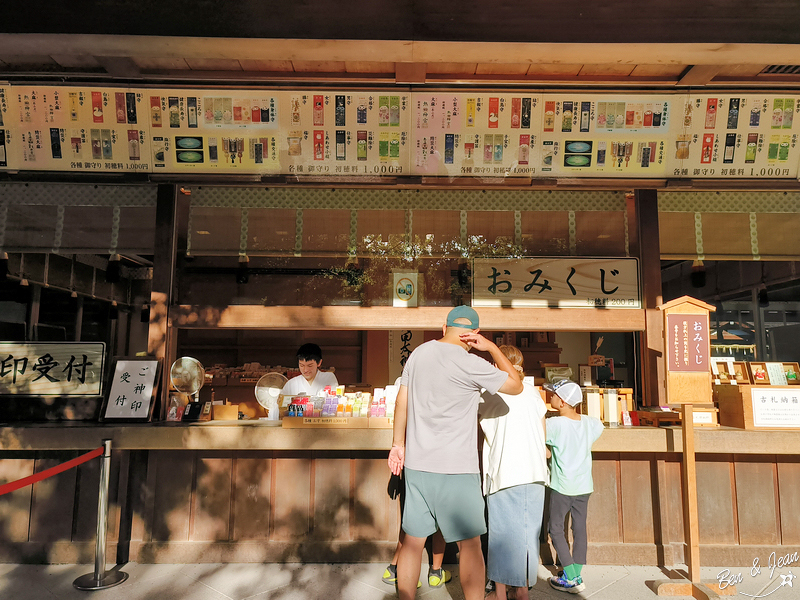 若想求 御神籤,需先在籤筒中搖出籤號,接著前往授與所向巫女報上號碼並支付 200日圓,即可獲得籤詩。