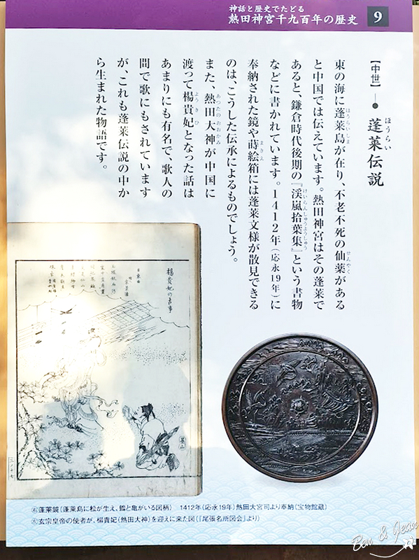此外,傳說熱田大神曾經渡海來到這片土地。關於楊貴妃渡海的故事,在古代日本的和歌詩人之間也非常有名,這同樣是「蓬萊傳說」衍生出的故事之一。