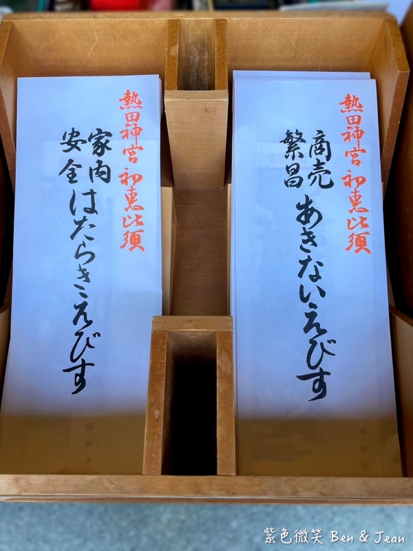 - 右側的符籤:「商売繁昌 あきないえびす」祈求 商業繁榮、生意興隆,適合從事商業或經營事業的人。