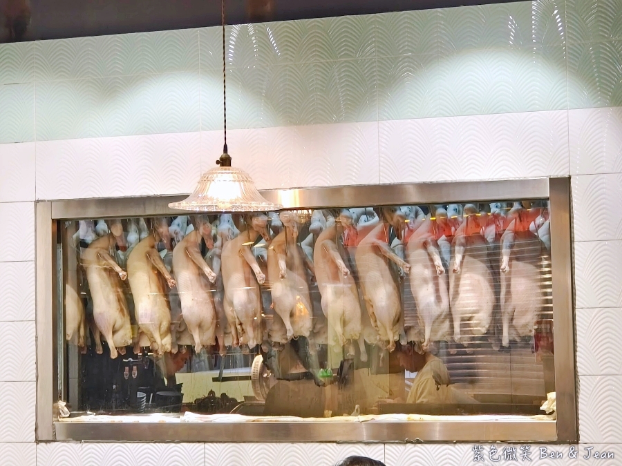 廚房後方掛滿滿滿的等待入爐的燒鵝啊