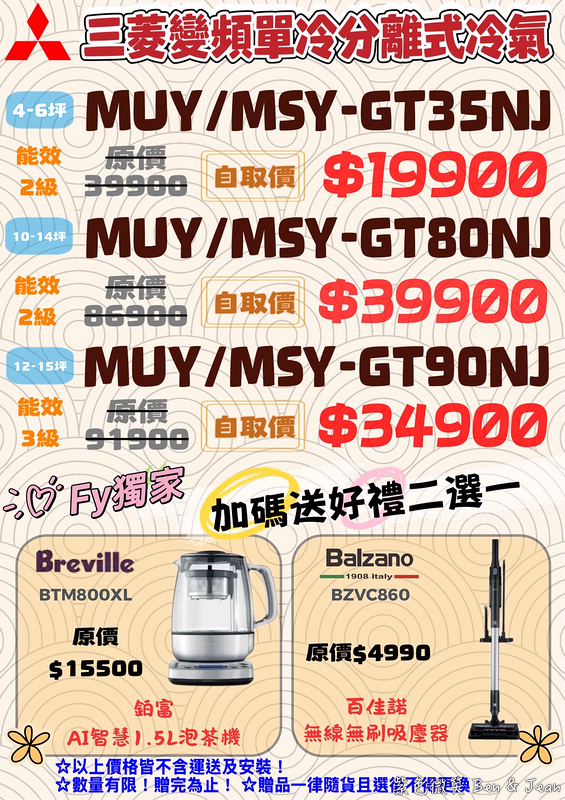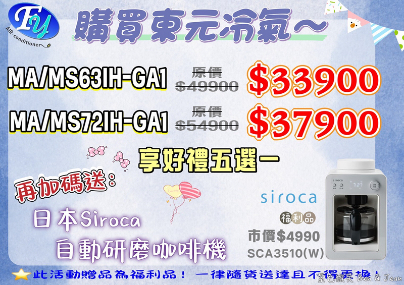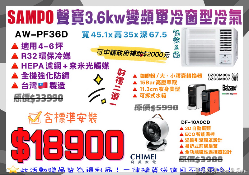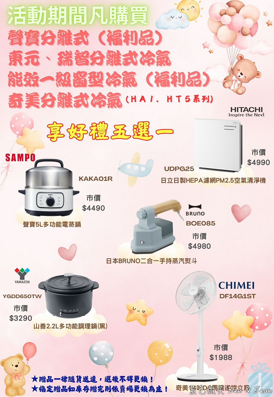 買冷氣都有好禮五選一,價值好幾千元的禮品哦