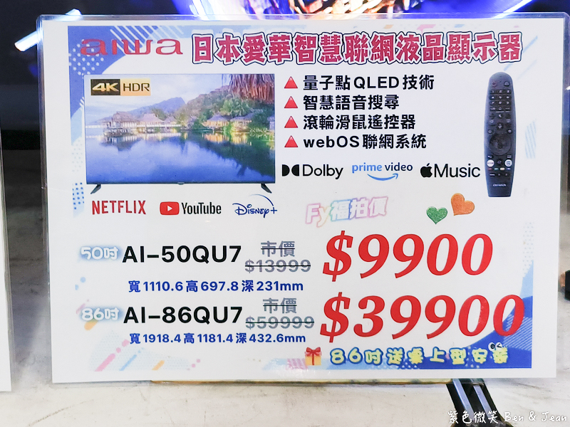 這款是日本愛華86吋的QLED 電視,與LG 同款,只要39900元,和與LG 同規格,但LG 要價81000元啊。