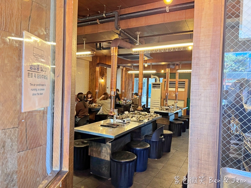室內設計融合了韓國傳統與現代工業風,使用木質桌椅與金屬元素,給人一種溫暖又時尚的感覺。