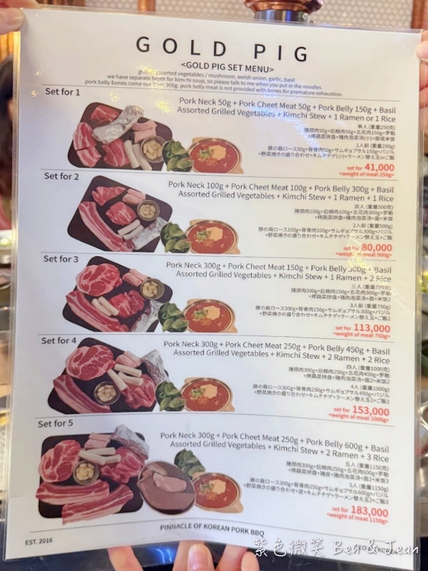 | 5人套餐 | 豬頸肉 300g + 豬頰肉 250g + 五花肉 600g + 羅勒 + 綜合烤蔬菜 | 泡菜鍋 + 2份拉麵 + 3碗白飯 | 1150g | 183,000 |