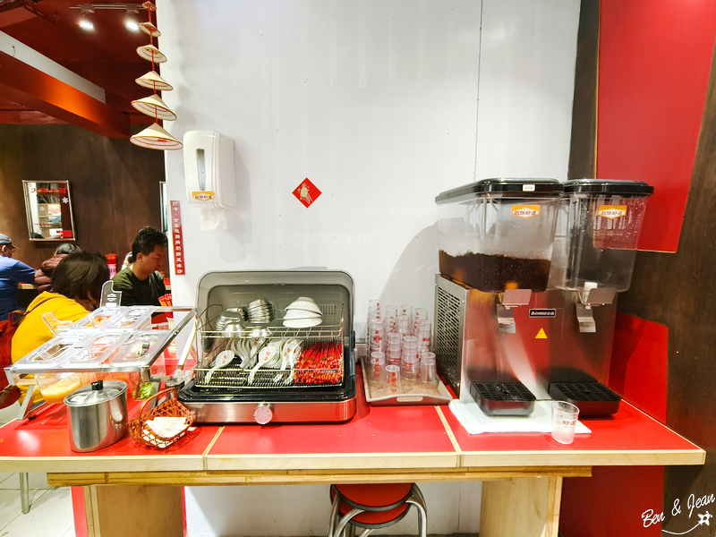自助餐具區,一旁有鳳梨醋的飲品,可以自行取用