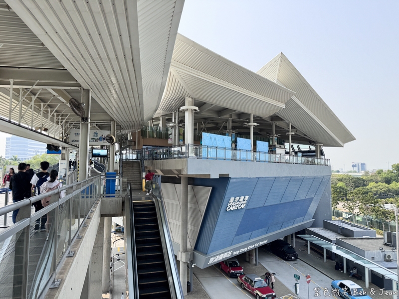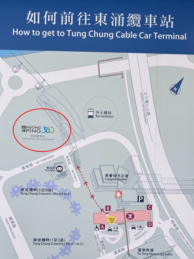 從地鐵東涌站B出口出站,對面就看的到昂坪纜車東涌站。從香港站搭乘地鐵到東涌站大約需要 33 分鐘。