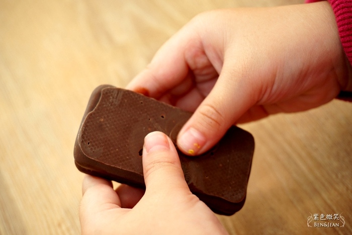 這是我們家小貝果哥哥的手,大約是剛剛餅乾的 1/3 ,但它口味濃郁的程度卻是餅乾的好幾倍啊!! 因為它是雙層的!!
