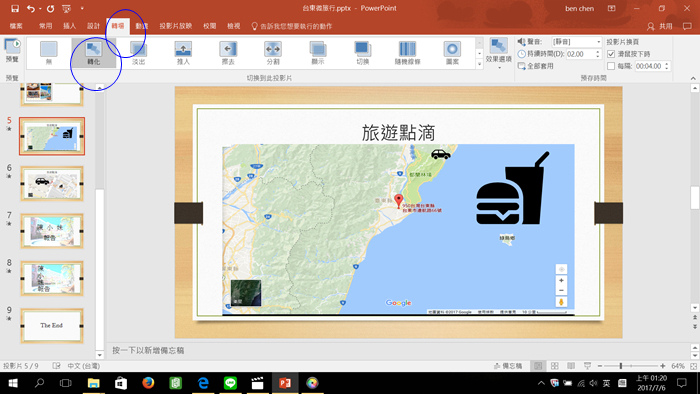 步驟二:點擊第二張的投影片,再點選功能表裡的「轉場」中的「轉化」效果