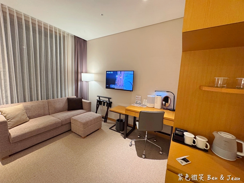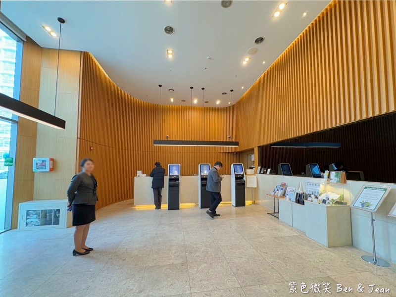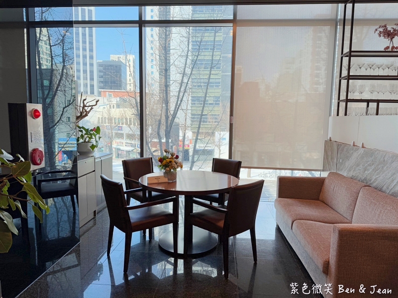 飯店設計風格現代簡約、整潔明亮。大廳門口有舒適的沙發座椅,我們常常坐在這裡等同伴。櫃檯提供中、英、韓語服務,辦理入住與退房快速便利。