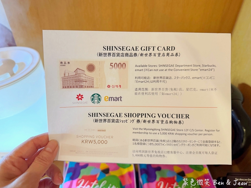 新世界百貨商品券、購物折扣金額:KRW 5,000元,可使用店家:新世界百貨、Starbucks、emart。