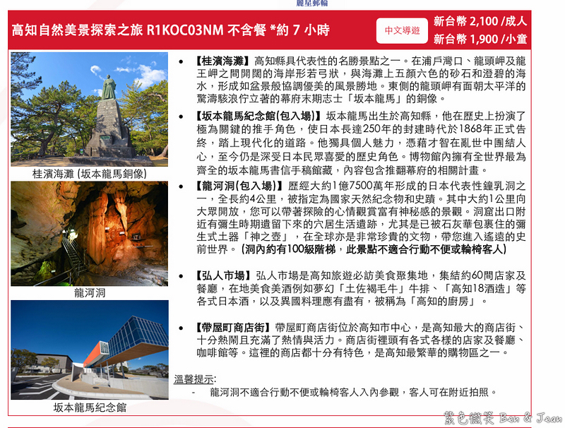 其實岸上的行程有好幾個可以選,高知的部份,我們選了高知自然美景探索之旅