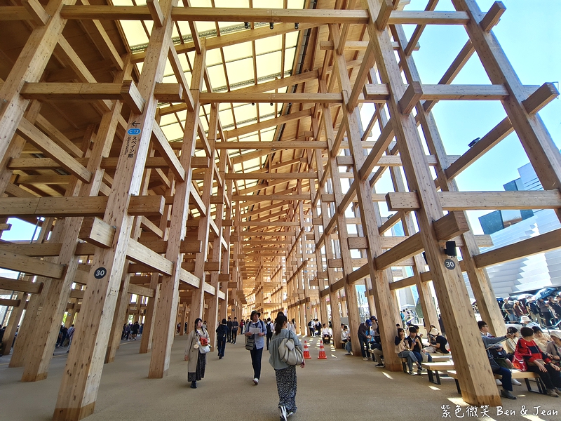 非常壯觀的木造建築大屋根,底下是休息的好地方,也可以上大屋根的屋頂走道,環繞會場一圈