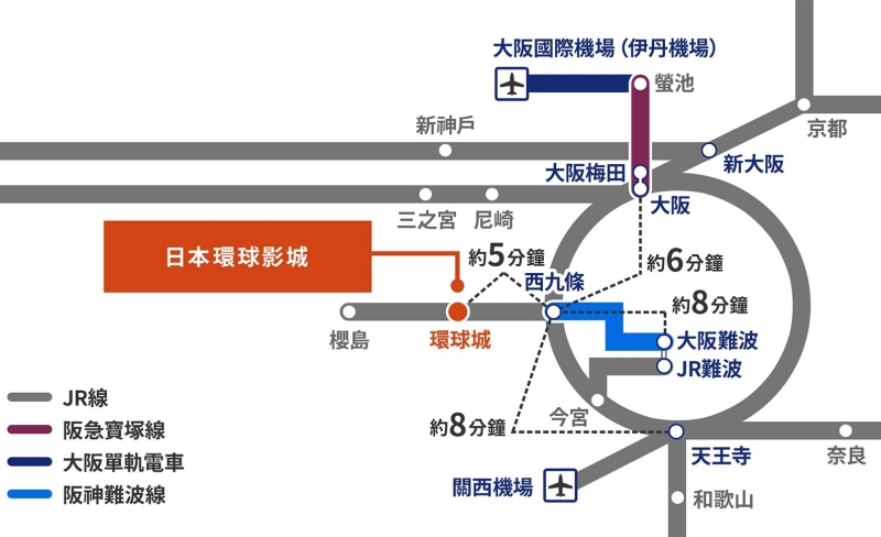 | 大阪站 | JR大阪環狀線 → 西九條 → JR夢咲線(櫻島線)至環球城站 | 西九條 | 15分鐘 | ¥180 |