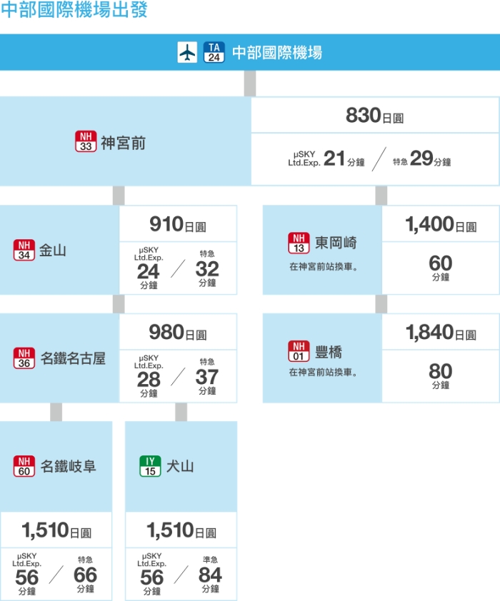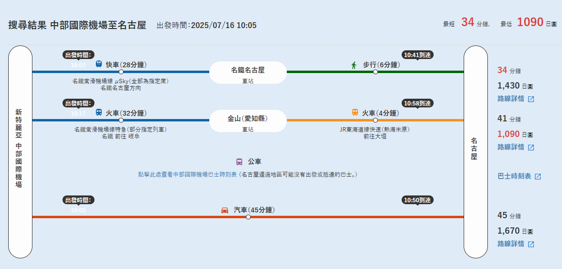 只要在 官網 輸入航班號碼與日期,即可查詢從中部國際機場出發前往各城市的列車時刻與票價資訊,非常方便!